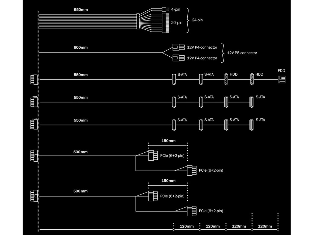 - Délka napájecího kabelu pro PCI Express: 50 cm