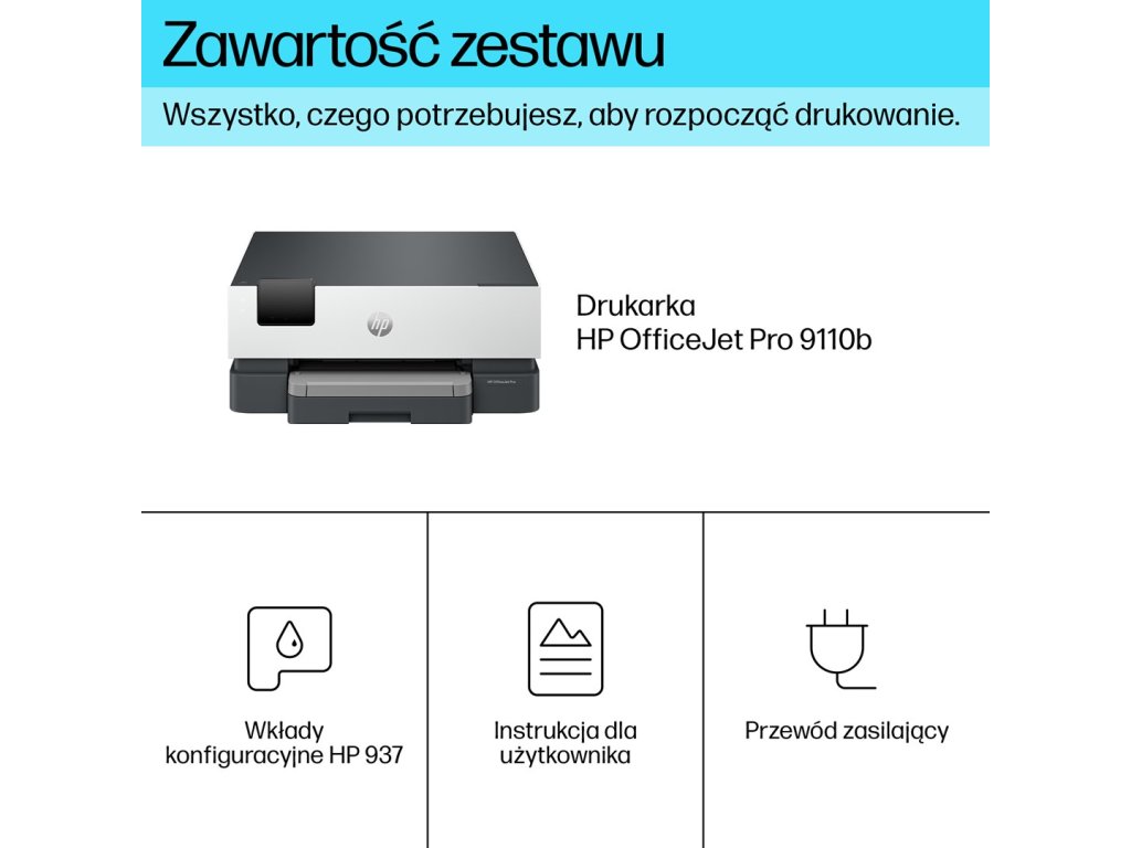 | Obsah krabice: | Tiskárna HP OfficeJet Pro 9110b; Černá startovací inkoustová kazeta HP 937 (cca 800 stran); Azurová startovací inkoustová kazeta HP 937 (cca 420 stran); Purpurová startovací inkoustová kazeta HP 937 (cca 420 stran); Žlutá startovací inkoustová kazeta HP 937 (cca 420 stran). Leták s regulačními informacemi; Leták s upozorněním na inkoust; Napájecí kabel; Instalační leták; Referenční příručka. [Skutečná výtěžnost se liší v závislosti na obsahu tištěných stránek a dalších faktorech. Podrobnosti jsou k dispozici na stránce https://www.hp.com/go/learnaboutsupplies] |